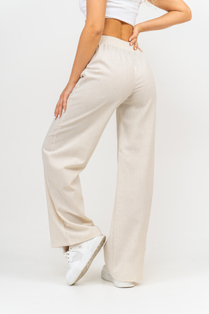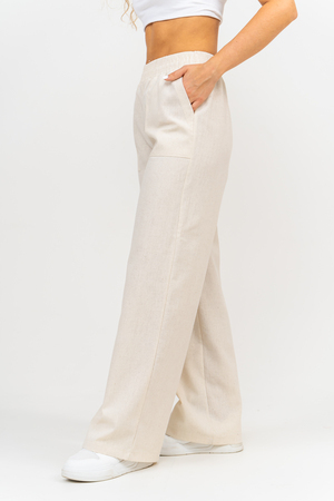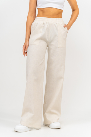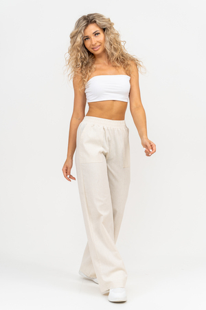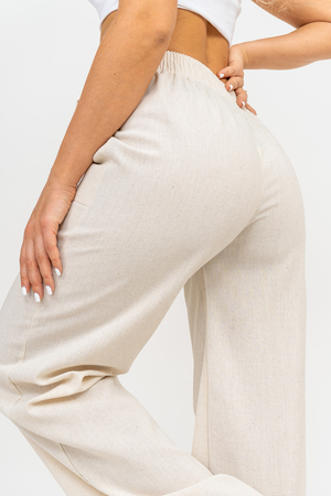 Стильные и современные женские летние брюки - палаццо выполнены из прочного, износостойкого, долговечного и приятного к телу материала. Это экологичный материал, обладающий отличной гигроскопичностью и воздухопроницаемостью. Одежда из ткани, в состав которой входит лён, способствует естественной терморегуляции тела и отлично подходит для летнего сезона и жаркого климата. Спереди брюк настрочены два вместительных накладных кармана. Пояс выполнен на специализированной поясной машине. Это качественная и современная обработка, при которой Ваш пояс не деформируется со временем, при стирке и не даёт резинке скрутиться. Льняные брюки - это универсальная вещь, они подойдут для работы в офисе, для школы, прогулок, на праздник или для дома. Особый шарм брюки приобретают во время отпуска, отдыха на море, на курорте или пляже. Брюки - палаццо с завышенной посадкой красиво подчеркивают талию и линию бедра, создавая лаконичный и стильный образ. Брюки такого плана подходят под разные стили - casual, спортивный, неформальный, пляжный морской, бохо и конечно более строгие варианты - классика, деловой офисный стиль. Длинные брюки на резинке - идеальный вариант для современной женщины, которая много времени проводит на работе. Базовая популярная модель позволяет чувствовать себя удобно и комфортно в течении всего рабочего дня. Лёгкие и свободные брюки с карманами из премиум ткани отлично подходят для жаркого лета, пляжа, вечеринки, танцев или домашнего отдыха. Элегантные брюки помогут создать красивые вечерние образы, а также помогут выглядеть эффектно на праздничной фотосессии или выпускном.