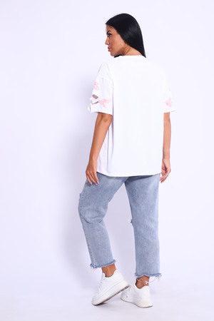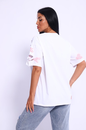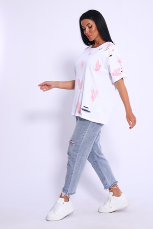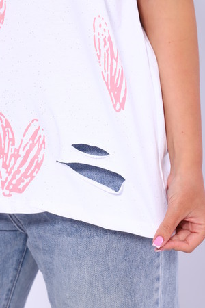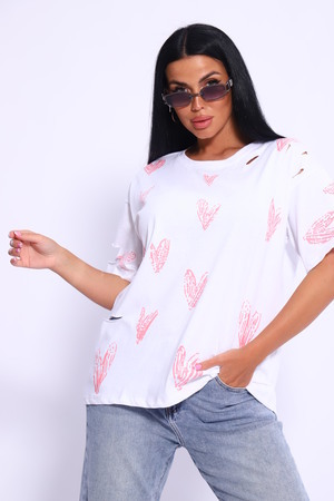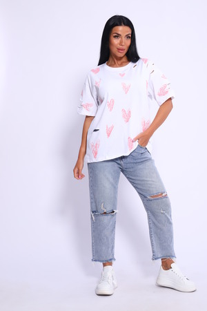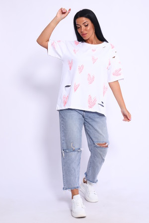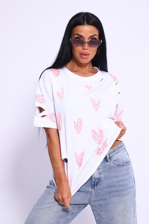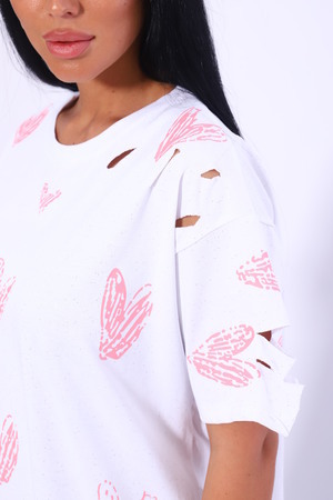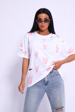 Рваная женская футболка. Oversize подходит всем типам фигур. Изготовлена из хлопка, плотная и не просвечивает. На ткани имеется принт в виде сердечек. Дырки расположены на рукавах и спереди. На ткани имеются небольшие блестки, которые очень красиво мерцают на солнце. Свободная посадка и прямой крой. Длинная хлопковая футболка отлично подойдёт для создания повседневных образов. Рукав спущенный и не сковывает движения. Длина рукава указана от плечевого шва. Производство Китай.