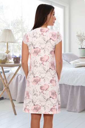 Сорочка из вискозы, с коротким рукавом из эластичного мягкого кружева, лиф также декорирован кружевом и бантиком из атласной ленты. Сорочка полуприлегающего силуэта, длиной выше колена.
