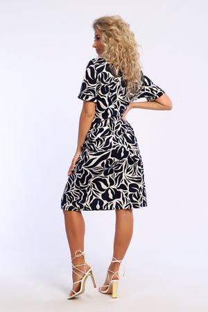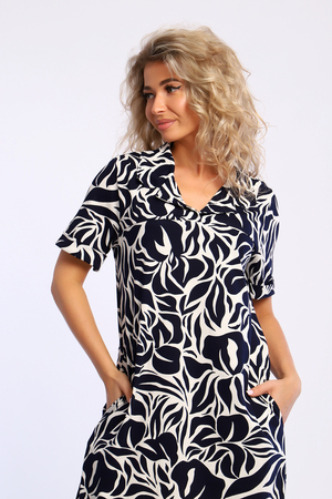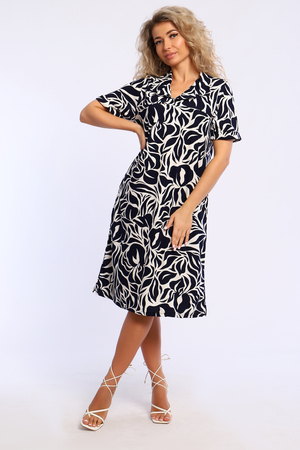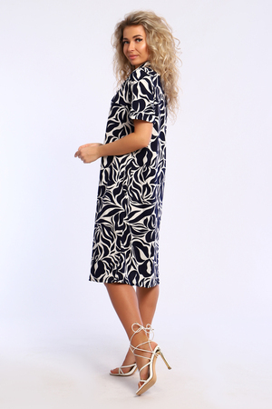 Платье полуприлегающего силуэта с короткими рукавами, с отворотными манжетами и рубашечным воротником. В боковых швах карманы.