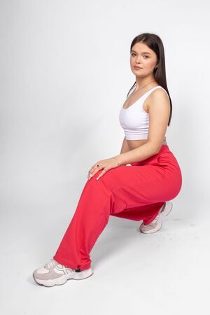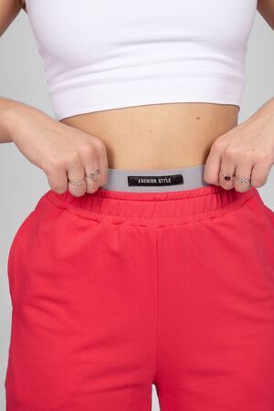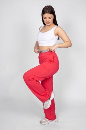 Брюки женские прямого силуэта. Пояс отрезной, выполнен из основного полотна, с эластичной тесьмой внутри. К верхнему срезу поясу притачена резинка, но выглядывает из пояса. На резинке декоративная нашивка. Надпись переводится как "Модный стиль". Модель рассчитана на рост 164-170см.