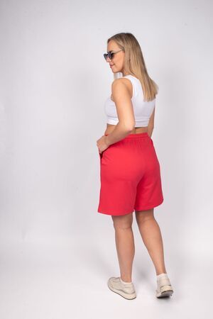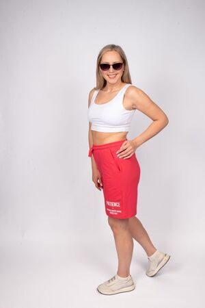 Шорты женские прямого силуэта. Отрезной пояс из основного полотна, с эластичной тесьмой закрепленной в шов. По поясу шорт вставлен плоский утягивающий шнурок, в цвет пояса. На передней половинке шорт выполнены карманы с отрезным бочком. Низ изделия обработан швом в подгибку. На левой передней половинке шорт принт шелкография. Надпись переводится как "Терпение; Ничто тоящее не делается легко". Модель рассчитана на рост 164-170см.