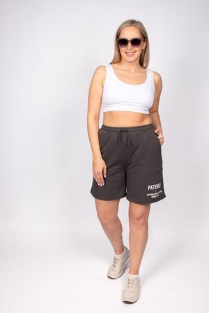Шорты женские прямого силуэта. Отрезной пояс из основного полотна, с эластичной тесьмой закрепленной в шов. По поясу шорт вставлен плоский утягивающий шнурок, в цвет пояса. На передней половинке шорт выполнены карманы с отрезным бочком. Низ изделия обработан швом в подгибку. На левой передней половинке шорт принт шелкография. Надпись переводится как "Терпение; Ничто тоящее не делается легко". Модель рассчитана на рост 164-170см.