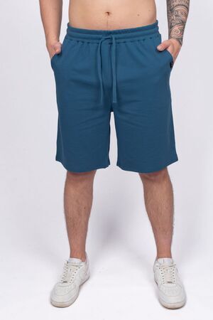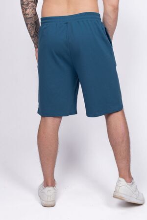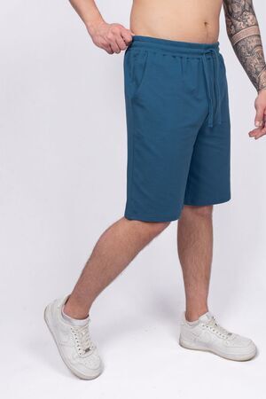 Шорты мужские прямого силуэта. Пояс отрезной, выполнен из кашкорсе, в цвет изделия, с эластичной тесьмой внутри, закрепленной в шов. По поясу шорт вставлен плоский утягивающий шнурок. На передней половинке шорт выполнены карманы с отрезным бочком. Низ изделия обработан швом в подгибку. На левом кармане вшивной элемент, закрепленный отстрочкой. Модель рассчитана на рост 176-182см.