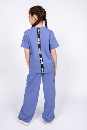 Футболка детская прямого силуэта с втачным коротким рукавом. Горловина круглая, обработана воротником из кашкорсе. Горловина спинки внутри укреплена бейкой из кулирки. Низ изделия и рукава обработан швом вподгибку. На спинке принт Шелкография. Надпись переводится как "Спорт".