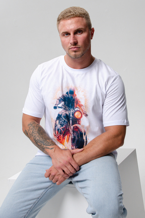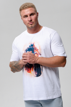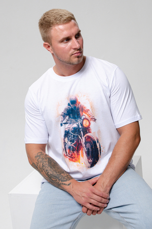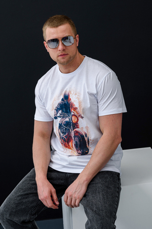 Футболка прямая, свободная, средней длины, с округлой горловиной. Рукав короткий. Горловина обработана эластичной обтачкой.