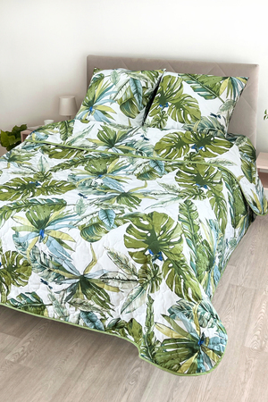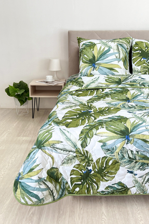 Уникальность набора в том, что в него входят: наволочки, простыня и легкое всесезонное одеяло. Это современное и очень удобное решение, которое идеально подходит тем, кто хочет быстро застилать кровать. Покупая постельные комплекты с одеялом вы экономите на покупке отдельного одеяла. Так же одеяло можно использовать как покрывало.  Комплект легко стирается в обычной машине. Состав комплекта: Полисатин 90 г/м2, одеяло - наполнитель синтепон 150 г/м2.