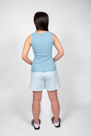 Пижама женская, состоящая из майки и шорт. Майка женская прилегающего силуэта. Пройма и горловина круглые, обработаны бейкой из кашкорсе. Низ майки обработан швом в подгибку. Шорты женские из набивного полотна. Пояс отрезной, выполнен из основного полотна в цвет изделия, с эластичной тесьмой внутри, закрепленной в шов. На передних половинах шорт карманы с отрезным бочком. Низ шорт обработан швом в подгибку. Модель рассчитана на рост 164-170 см.