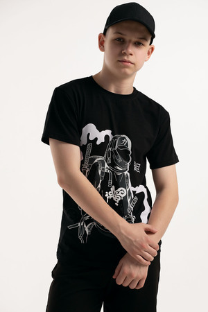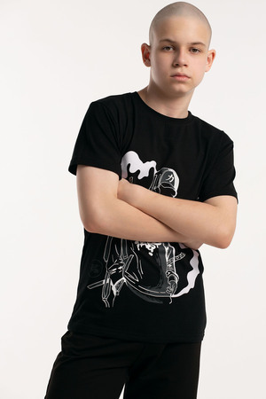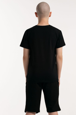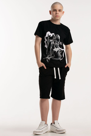 Костюм для подростков состоит из двух изделий - футболки и шорт. Футболка выполнена из ткани с абстрактным принтом. Футболка прямого свободного кроя, круглый вырез горловины, втачной рукав. Шорты выполнены из футера 2-х нитки, прямого кроя, с удобной посадкой. На передней половинке шорт - печать.