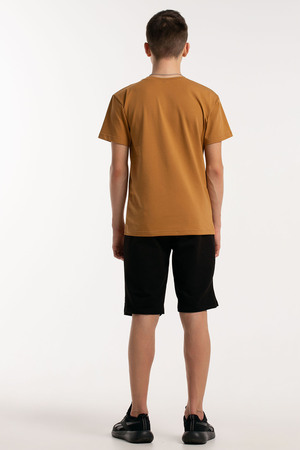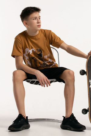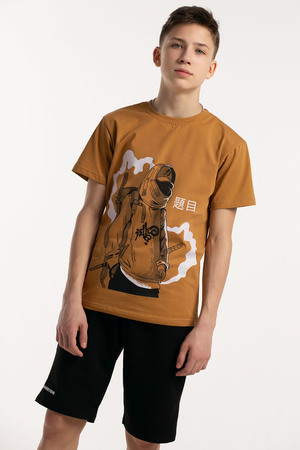 Костюм для подростков состоит из двух изделий - футболки и шорт. Футболка выполнена из ткани с абстрактным принтом. Футболка прямого свободного кроя, круглый вырез горловины, втачной рукав. Шорты выполнены из футера 2-х нитки, прямого кроя, с удобной посадкой. На передней половинке шорт - печать.