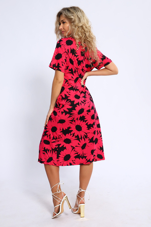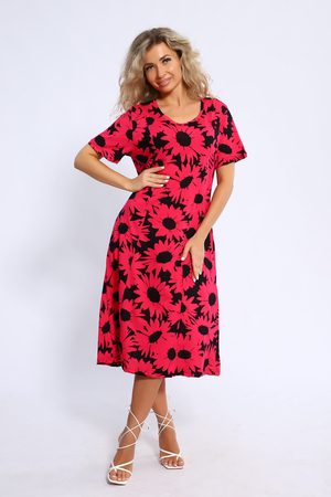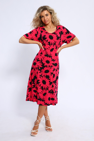 Платье с круглым вырезом горловины, немного приталенное, к низу расклешенное. Карманы в боковых швах.