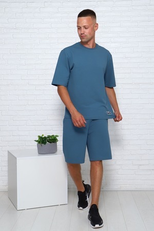 Костюм мужской из футера 2-х нитки: шорты на эластичном комфортном поясе, с боковыми карманами и футболка прямого кроя, со слегка спущенным плечом, с принтом по низу полочки. Данный трикотаж имеет низкую сминаемость и презентабельный вид.