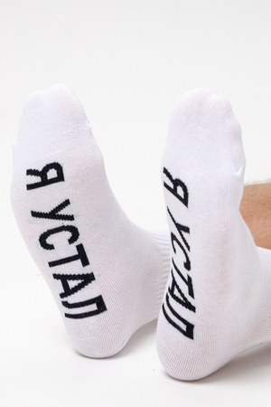 Мужские носки в комплекте 1 пара. Широкая резинка по всей верхней части носка. Надпись на стопе "Я устал"