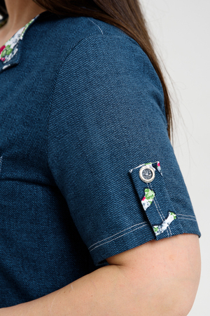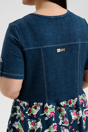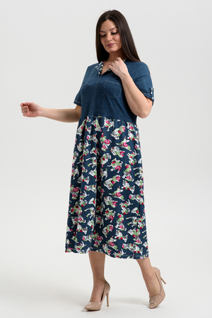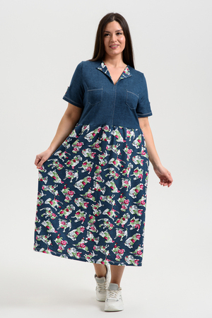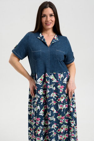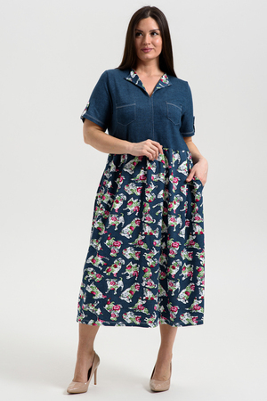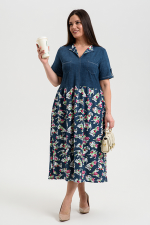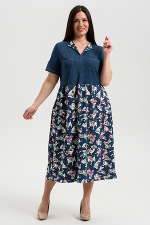 Фасон платья позволяет легко скрыть недостатки фигуры и при этом элегантно выглядеть! Платье отрезное по линии талии, с боковыми карманами, длиной ниже колена, юбка из отделочного полотна со сборкой по линии талии. Полочка с V-образной горловиной и отложным воротником, с накладными карманами. Спинка с кокеткой и вертикальными рельефами. Рукав втачной, короткий, с патой и пуговицей. Горловина спинки обработана бейкой из основного полотна.