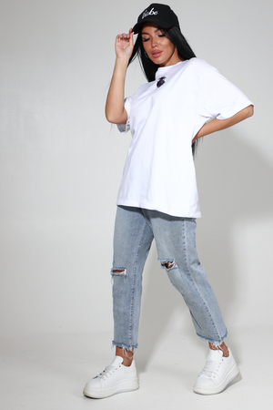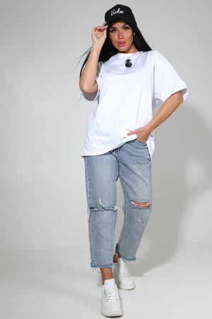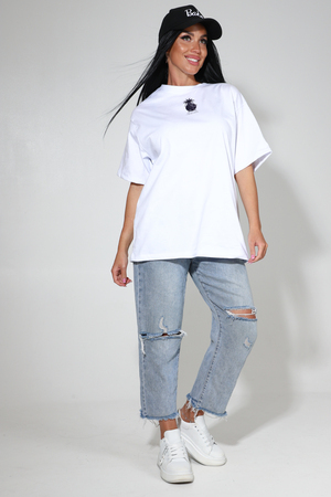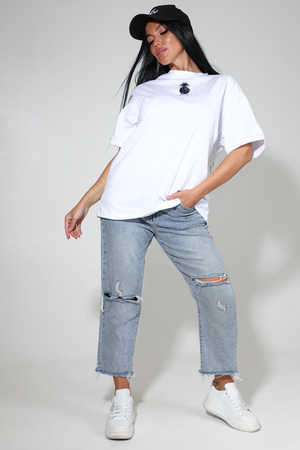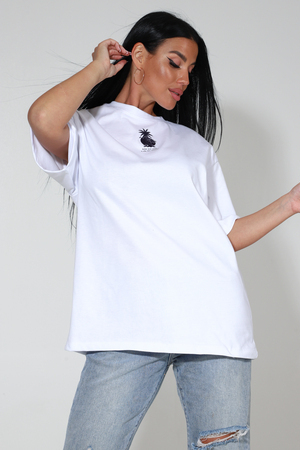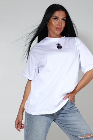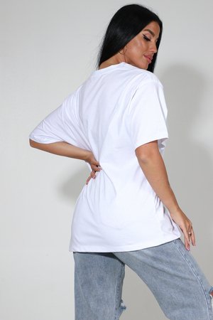 Базовая женская футболка оверсайз из 100% хлопка с печатью в виде надписи и рисунка. Футболка свободного кроя, хорошо сочетается с джинсами, брюками, юбкой, как в заправленном виде, так и навыпуск. Легко создать спортивный или повседневный стиль. Плотность ткани 180гр/м2.