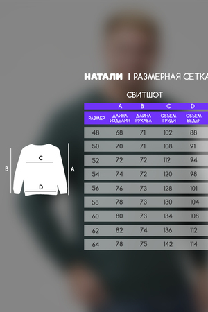 Анастасия28.10.2024 в 15:51Свитшот хороший, только все таки нужно учесть что до роста 176. Мужу на рост 189 см размер 52 взяла 56 размер по ширине ок, но вот рукава очень короткие оказались