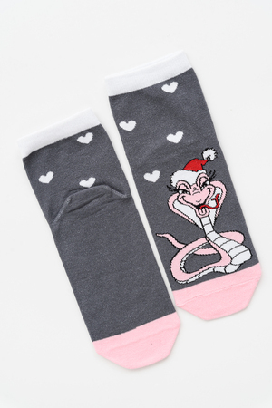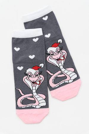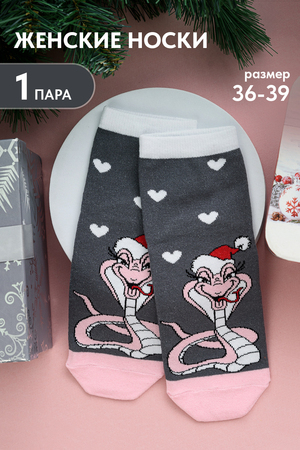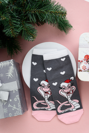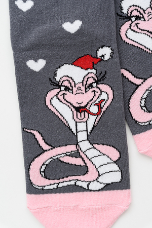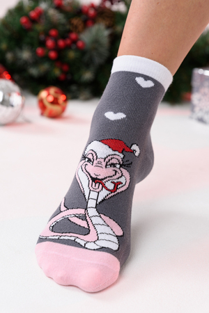 Оригинальные женские новогодние носки. В комплекте 1 пара. На основной части носка изображение символа будущего года Змеи.