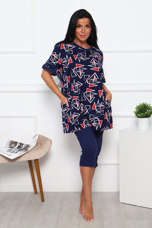 Костюм женский выполнен из трикотажного полотна кулирка. Костюм состоит из футболки и бридж. Футболка свободного силуэта, по бокам карманы. Бриджи свободного кроя чуть ниже колен.