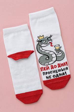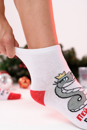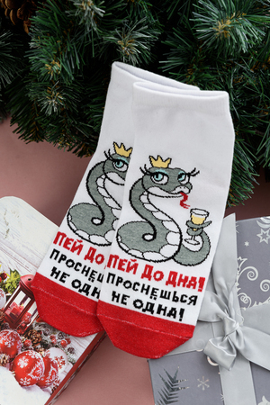 Оригинальные женские новогодние носки. В комплекте 1 пара. На основной части носка изображение символа будущего года Змеи.