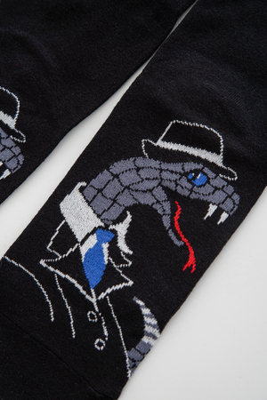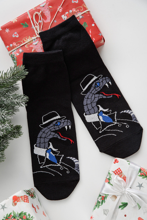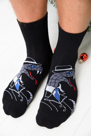 Оригинальные мужские новогодние носки. В комплекте 1 пара. На основной части носка изображение символа будущего года Змеи.