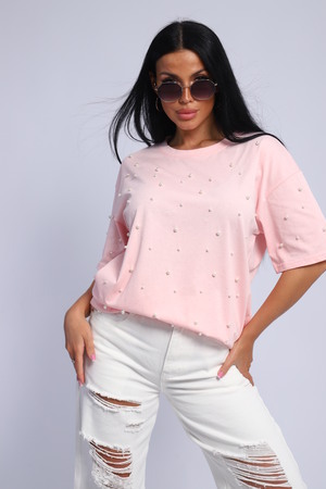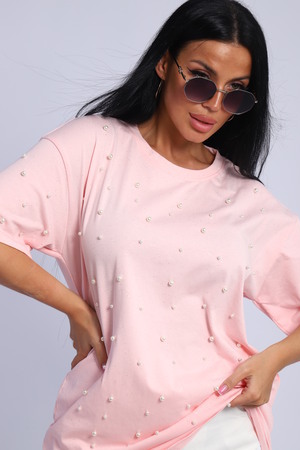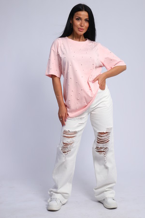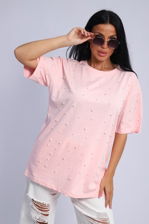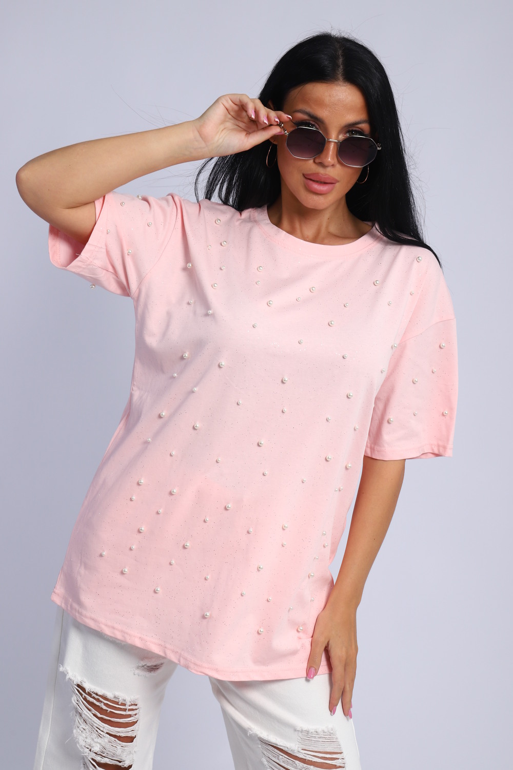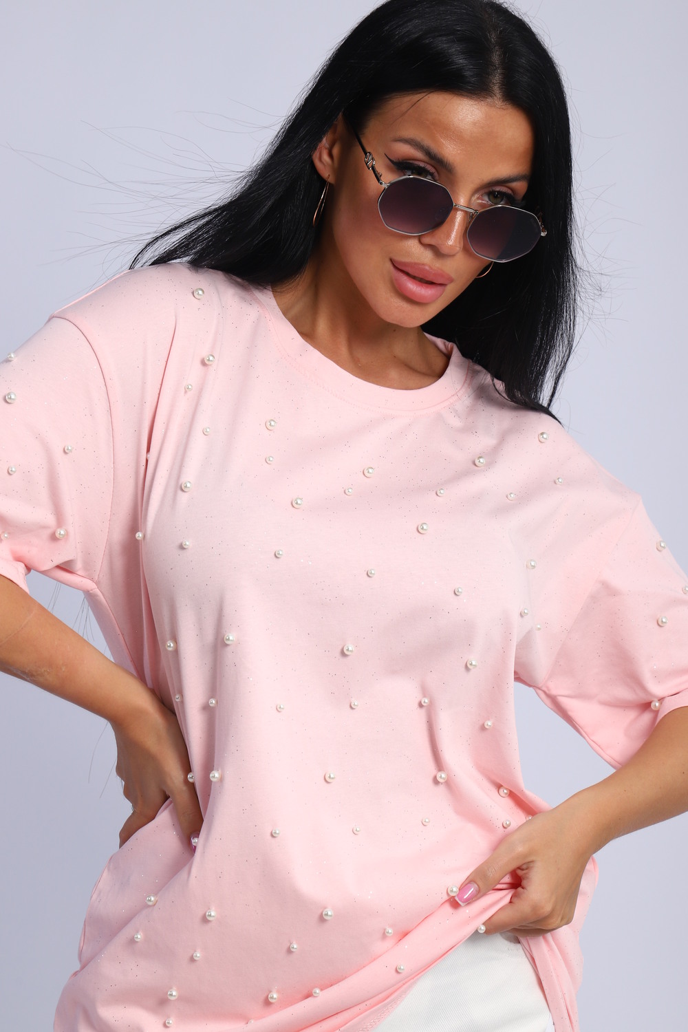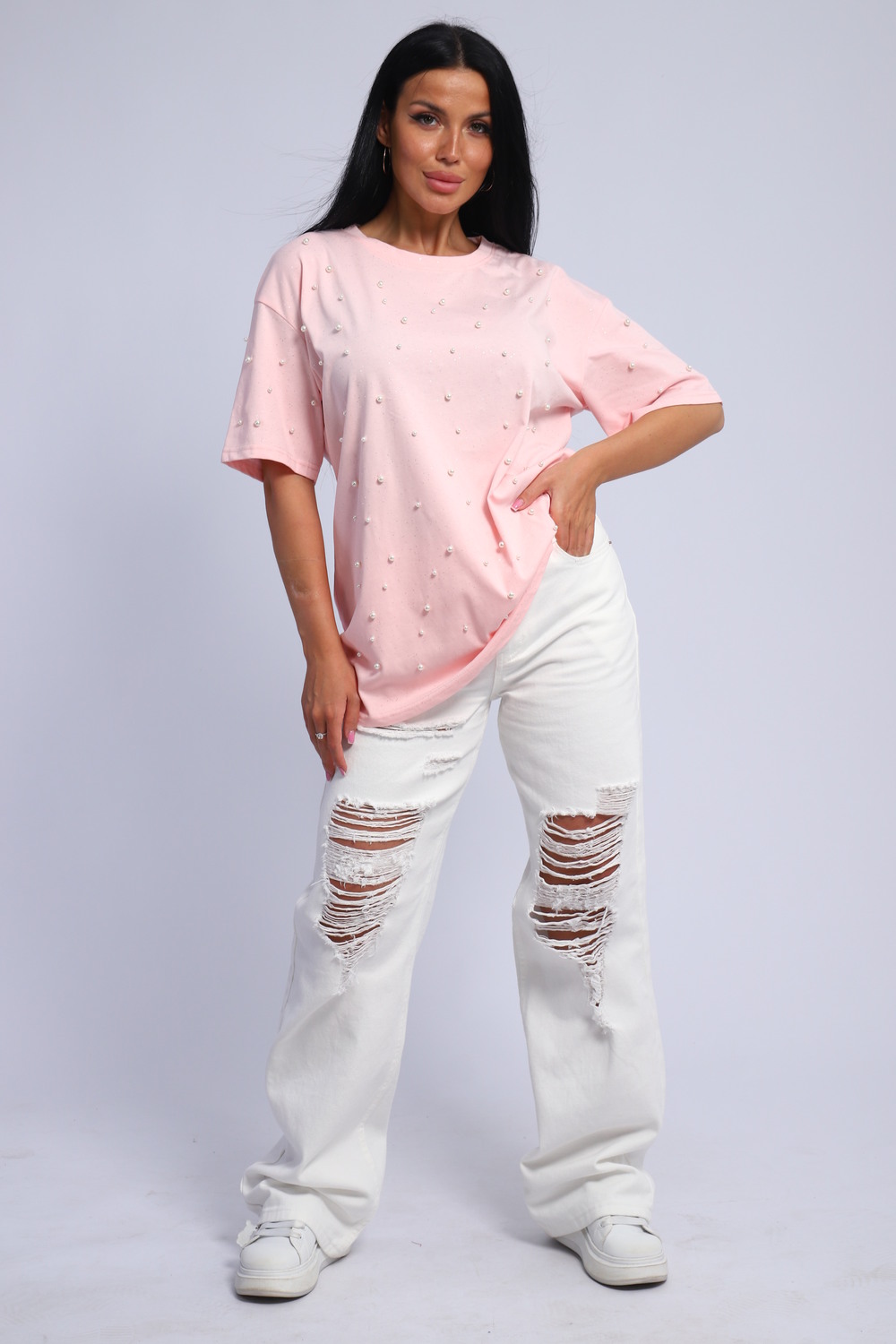 Женская футболка oversize. Очень приятная к телу. На ткани имеются жемчужинки, которые закреплены на ткани на сквозь, что позволяем им отлично держаться и не отваливаться. Популярный широкий крой и свободный стиль делают футболку удобной и универсальной. На ткани имеются небольшие блестки, которые очень красиво мерцают на солнце. Футболку можно сочетать с любым образом. Прямой силуэт. Идеально подходит на каждый день. Рукав спущенный и не сковывает движения. Длина рукава указана от плечевого шва. Производство Китай.