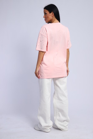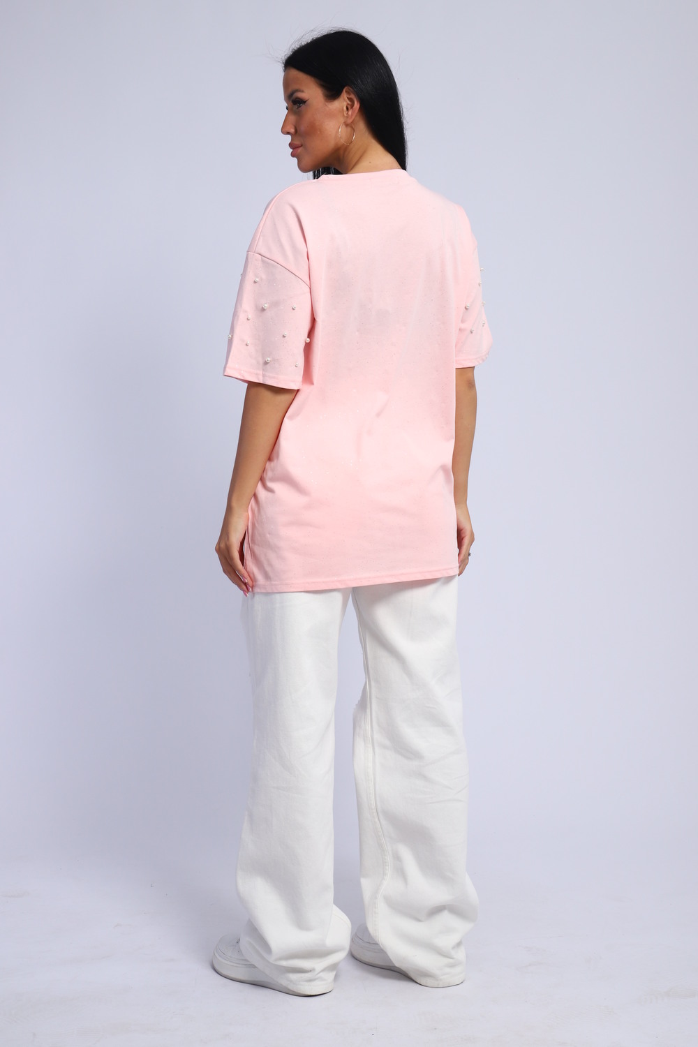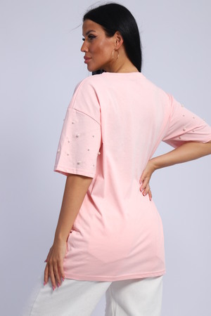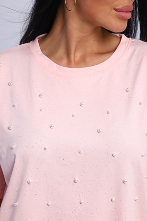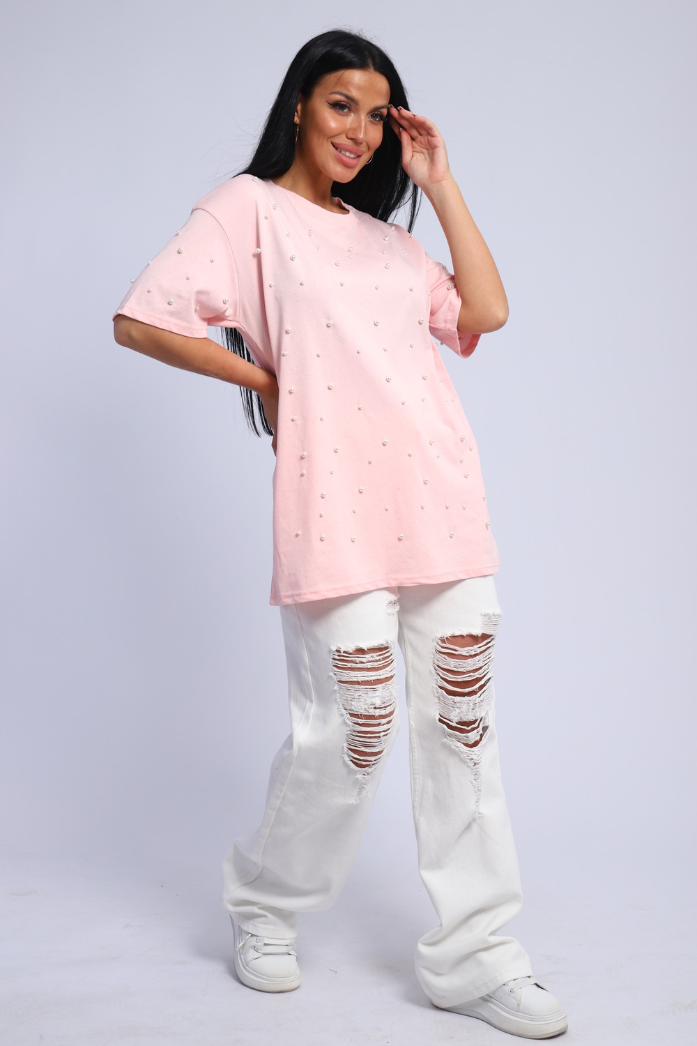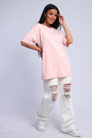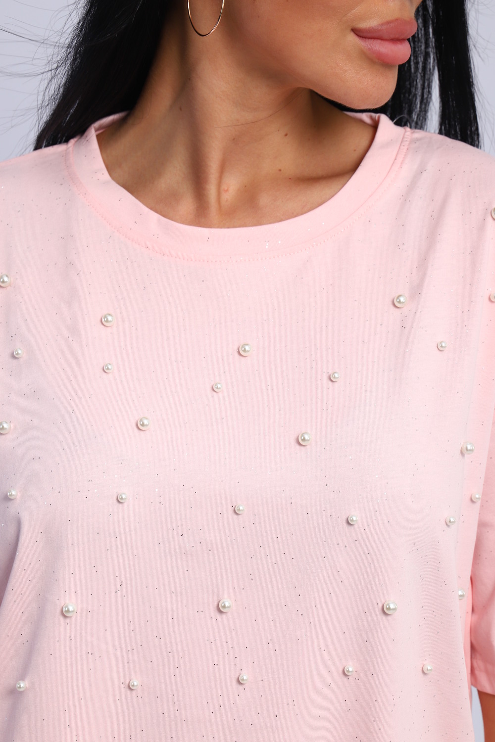 Женская футболка oversize. Очень приятная к телу. На ткани имеются жемчужинки, которые закреплены на ткани на сквозь, что позволяем им отлично держаться и не отваливаться. Популярный широкий крой и свободный стиль делают футболку удобной и универсальной. На ткани имеются небольшие блестки, которые очень красиво мерцают на солнце. Футболку можно сочетать с любым образом. Прямой силуэт. Идеально подходит на каждый день. Рукав спущенный и не сковывает движения. Длина рукава указана от плечевого шва. Производство Китай.