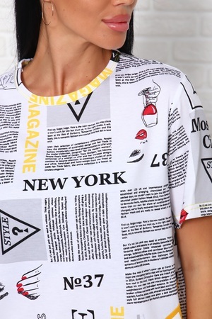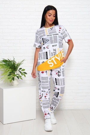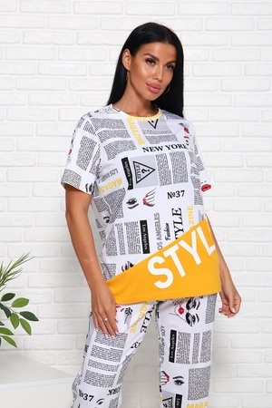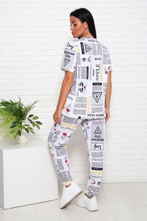 Костюм женский с брюками, материал в стилистике "Газетка". Футболка с короткими рукавами, полочка оригинального кроя с крупным принтом - надписью. Брюки на комфортном поясе, с боковыми карманами. Комфорт 100% хлопка.