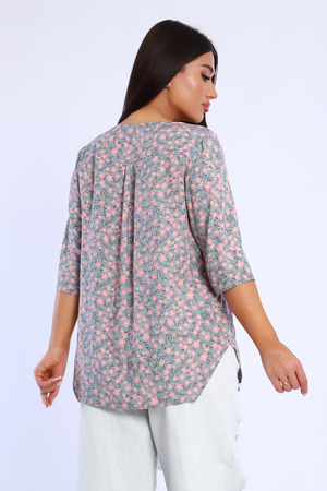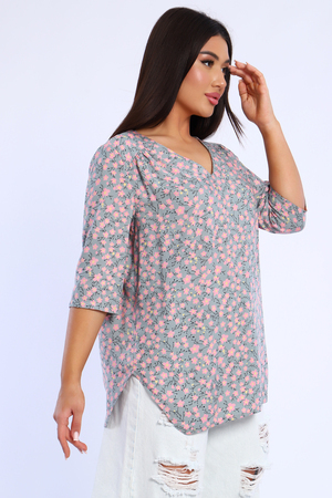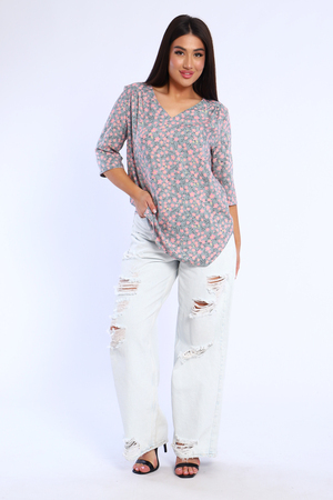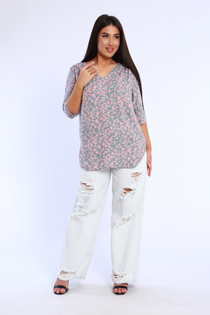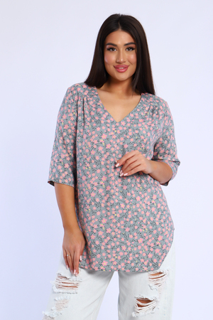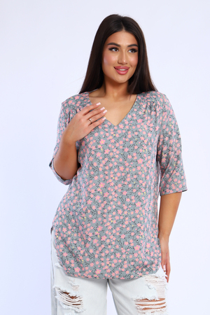 Удобная и просторная футболка с втачным рукавом 3/4. Ткань штапель делает ее очень приятной и комфортной в носке. Двойная кокетка на спинке, переходящая на полочку. Сборка по линии кокетки и складка на спинке добавляют объем изделию. Горловина с V-образным вырезом. Низ футболки фигурный, длина ниже линии бедра.