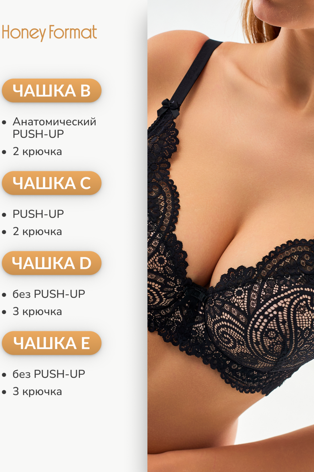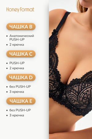 Кружевной бюстгальтер HoneyFormat отличается элегантностью и выразительностью. С корректирующим пуш-апом, на косточках, с комфортными глубокими чашечками этот бюстгальтер обеспечивает стильный вид и привлекательный силуэт. Изысканное кружево, добавляющее аккуратности и шарма, дополнено изящным съемным декоративным элементом, который помогает подчеркнуть форму груди. Благодаря надежной поддержке, удобной форме и тремя рядам крючков в качестве застежки этот бюстгальтер также обеспечивает комфорт и уверенность в себе в течение всего дня.