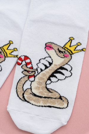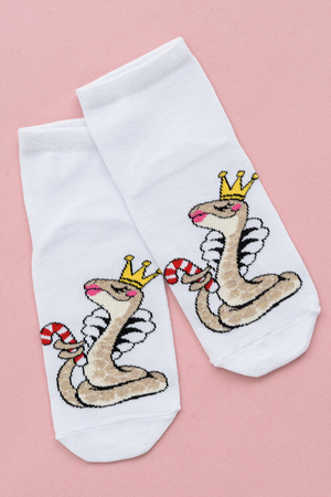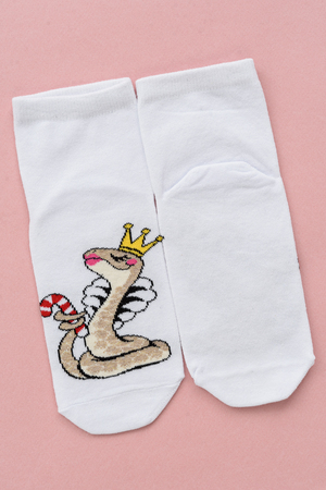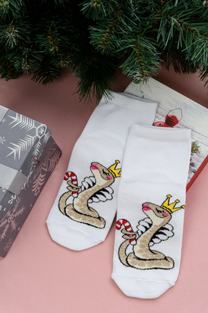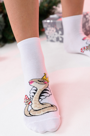 Оригинальные женские новогодние носки. В комплекте 1 пара. На основной части носка изображение символа будущего года Змеи.