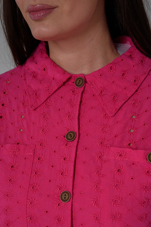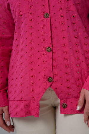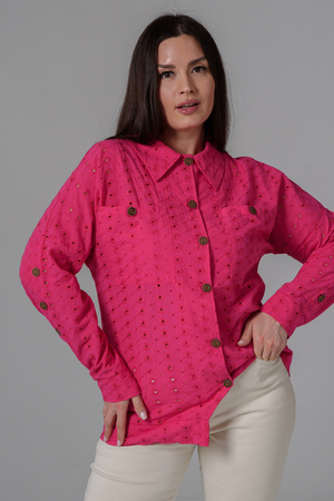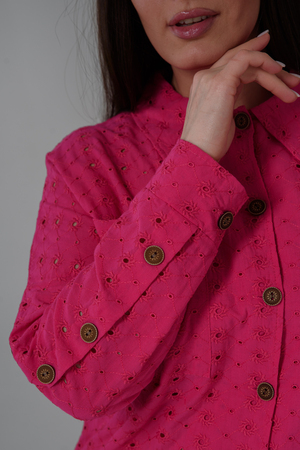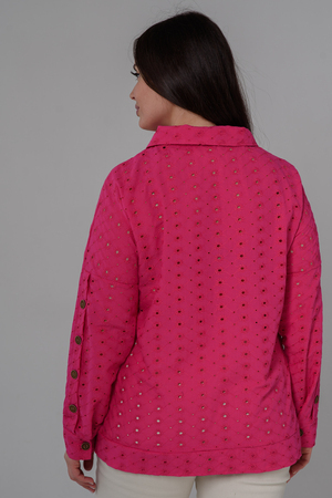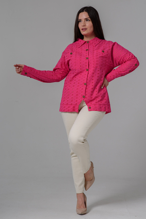 Рубашка женская, прямого силуэта, с притачным декоративным поясом внизу, воротник втачной. Рукав с заниженной линией плеча, с манжетой. Застежка на петли - пуговицы. На полочке два накладных кармана. Вдоль рукава складка с пуговицами. В летний период рубашка из красивой, натуральной х/б ткани незаменимая составляющая гардероба каждой модницы.