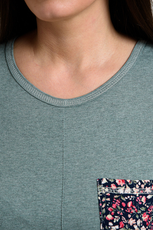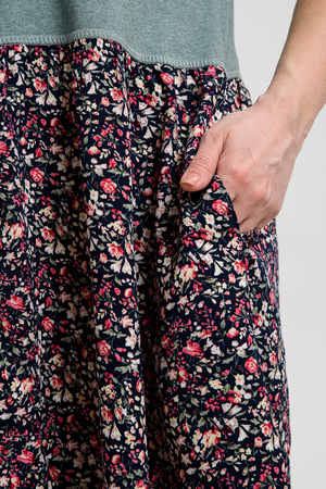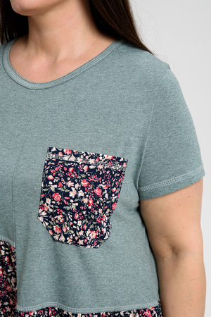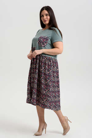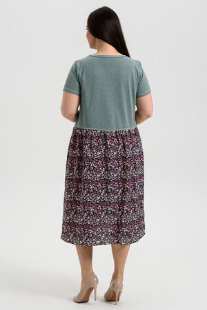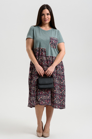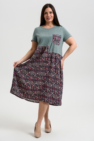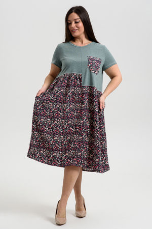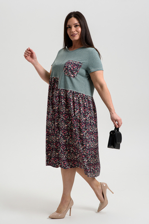 Платье женское полуприлегающего силуэта. Горловина округлая, рукав втачной короткий. Верхняя часть полочки и спинки, рукав из кулирки. Нижняя часть платья из штапеля в мелкий цветочек. Верхняя правая и верхняя левая части полочки заканчиваются на разных уровнях, на левой полочке нагрудный карман из штапеля. Нижняя часть платья слегка собрана, что дает более свободный объем по бедрам. В боковых швах внутренние карманы.