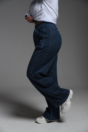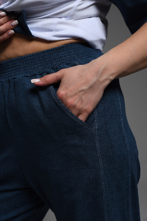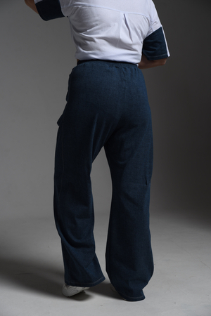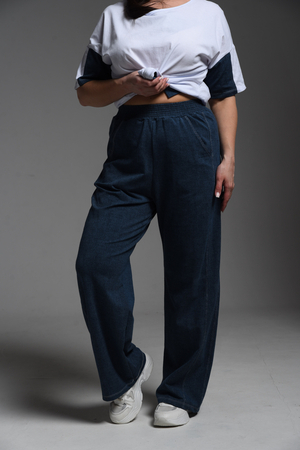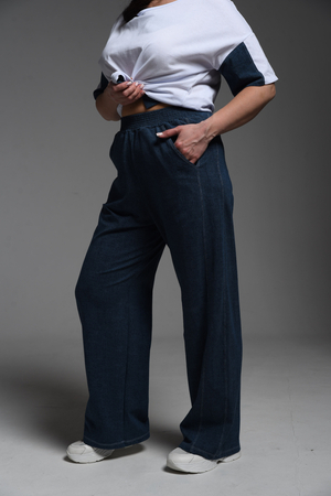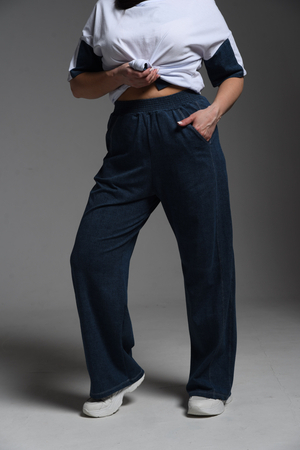 Брюки прямые, свободные, с лампасами вдоль боковых швов, на поясе, с боковыми карманами.