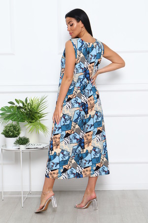 Сарафан женский выполнен из трикотажного полотна кулирка. Сарафан свободного силуэта, по бокам выполнены карманы, горловина и проймы окантованы.