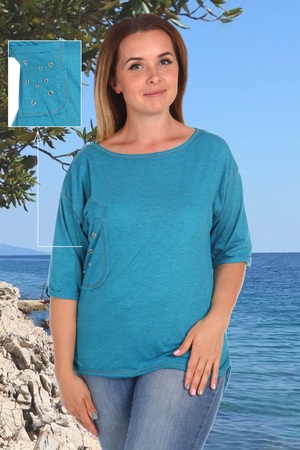 Футболка из кулирки с удлиненным рукавом с лайкрой. Спереди накладной карман, цвет однотонный, рукава до локтей. Три варианта расцветки — бирюзовая, салатовая и горчичная.