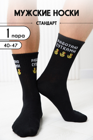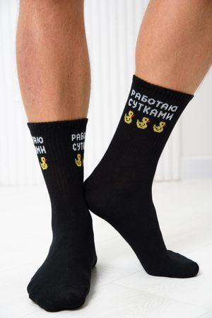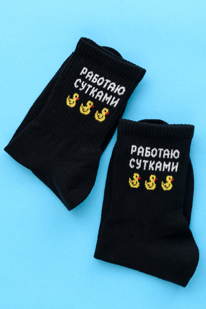 Оригинальные носки с изображением милых уточек на резинке. Носки высокие, резинка по все верхней части носка, надпись "Работаю сутками".