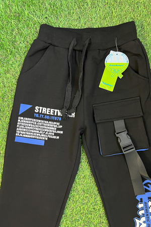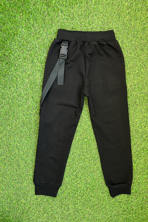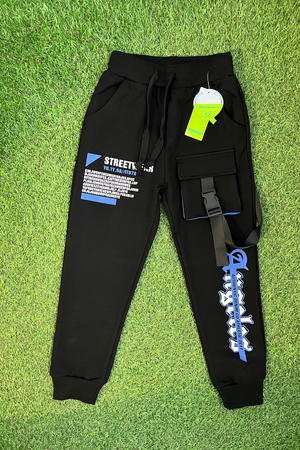 Брюки спортивные для детей из трикотажного полотна футер с лайкрой. Штаны на поясе из эластичного трикотажа с резинкой внутри, низ брюк на манжете из эластичного трикотажа. На передней части штанин накладной карман.