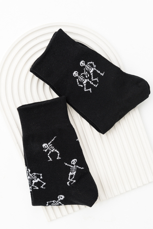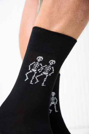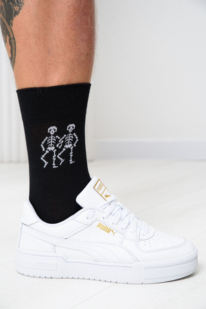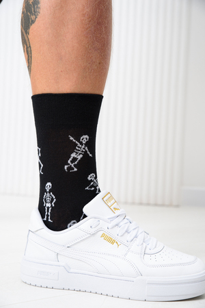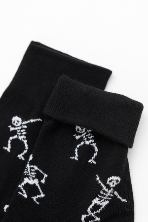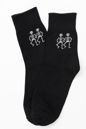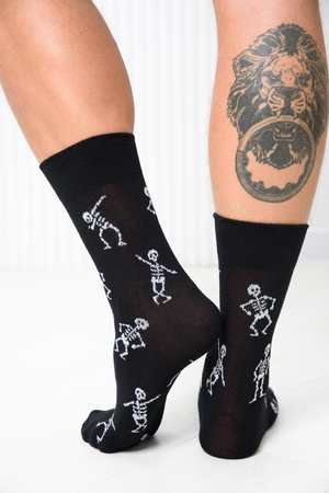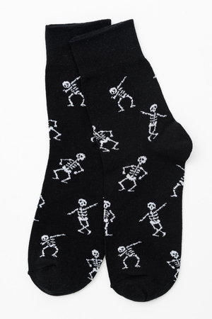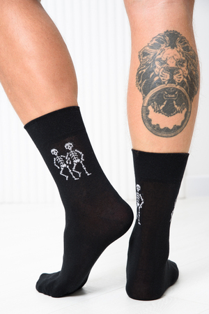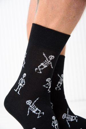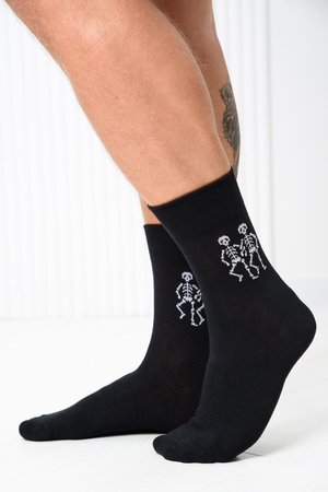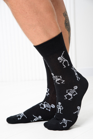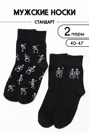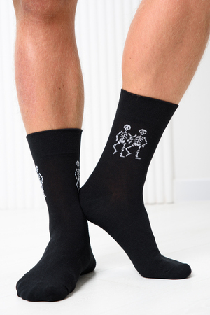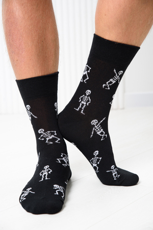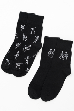 Комплект мужских носков состоящий из двух пар. На одной паре изображен один рисунок скелетов, на второй паре по всему носку изображения скелетонов.