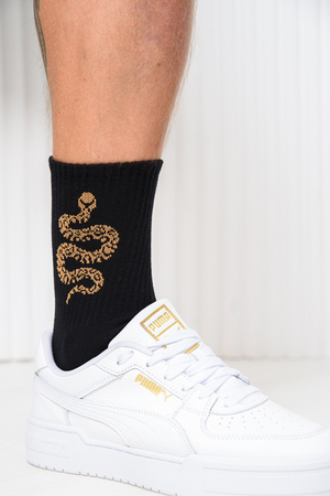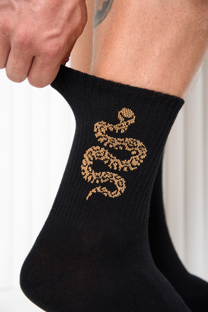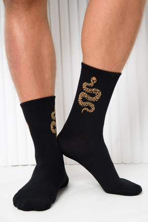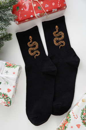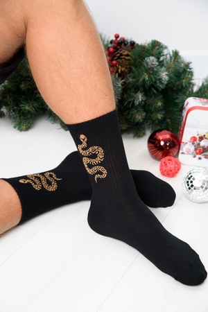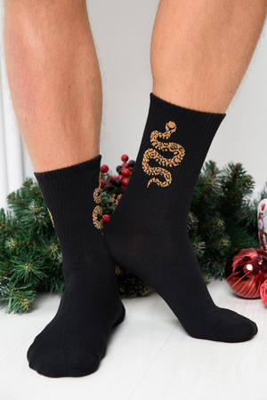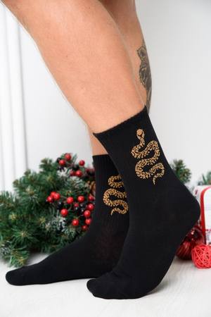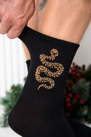 Оригинальные мужские новогодние носки. В комплекте 1 пара. На основной части носка изображение символа будущего года Змеи.