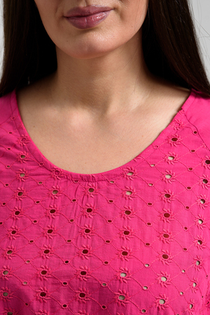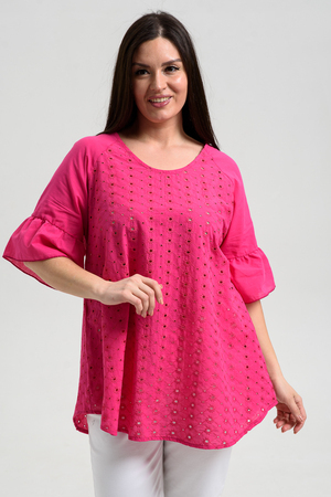Туника женская, расширенная к низу. Горловина округлая. Рукав реглан, внизу рукава широкая рюша. Низ туники фигурный, в боковых швах внутренние карманы. Свободная, легкая, не стесняющая движений туника незаменима для летнего гардероба любой женщины.