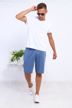 Шорты мужские классические, средней длины, с боковыми карманами, с принтом на левой стороне шорт, удобный эластичный пояс.