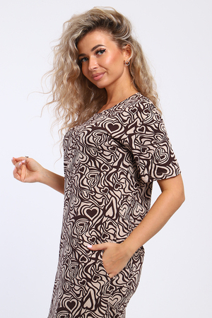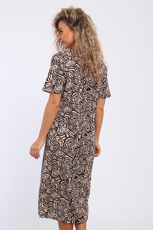 Платье полуприлегающего силуэта с короткими рукавами и разрезом на ноге. В боковых швах удобные карманы.