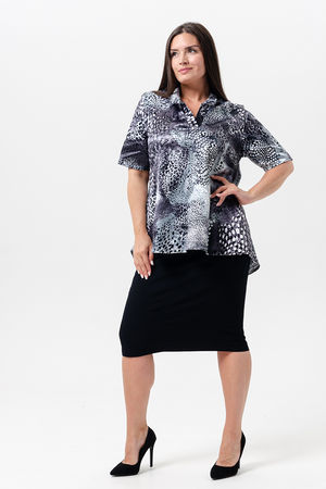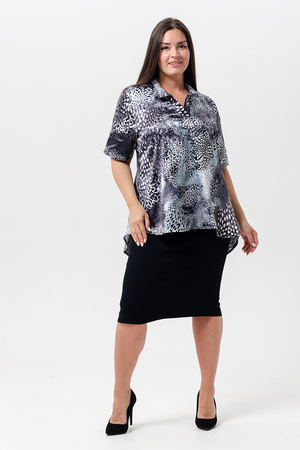 Женская летняя туника свободного кроя. Изделие с воротником рубашечного типа с планками, удлиненная спинка со "складной". Туника больших размеров. Подойдет для повседневной носки.