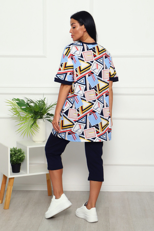 Костюм женский выполнен из трикотажного полотна кулирка. Костюм состоит из футболки и бридж. Футболка свободного силуэта, по бокам карманы. Бриджи свободного кроя чуть ниже колен.