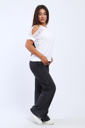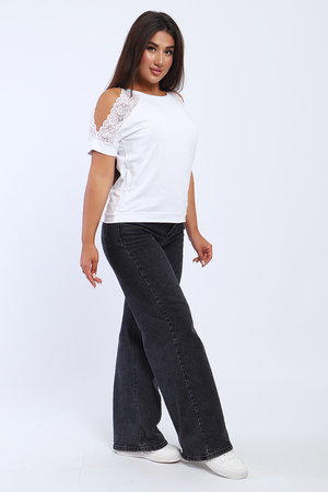 Футболка женская из кулирка с лайкрой высокого качества пенье. Модель с коротким реглан-рукавом, декорированным жаккардовым кружевом с фестонами по передней и задней полочке реглана, что создаёт вид слегка открытого плеча.  Круглая горловина обработана планкой, рукав и низ футболки на широком манжете. Стильная,  футболка - это базовая вещь для создания модного образа, актуальный вариант для торжественных и фуршетных мероприятий, а также на 1 сентября и повседневоной школьной формы.