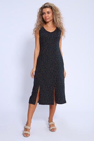 Легкий приталенный сарафан с V - образным вырезом горловины и двумя разрезами спереди. В боковых швах удобные карманы.