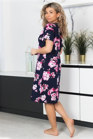 Халат женский из кулирного трикотажного полотна полуприлегающего расширенного к низу силуэта, длиной ниже колена. Рукав втачной, короткий. Застежка на тесьму"молния". Боковые карманы с округлым входом. Горловина ( округлой формы)и вход в карман окантованы основным полотном.