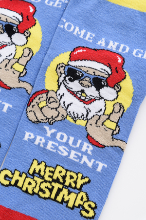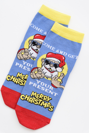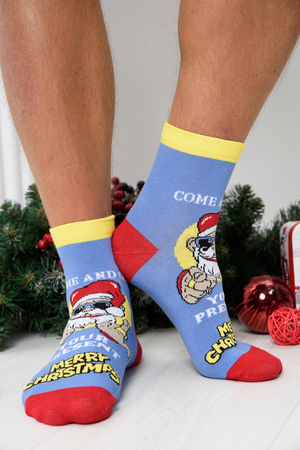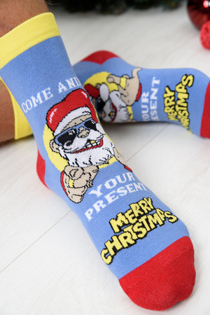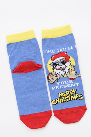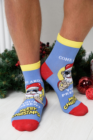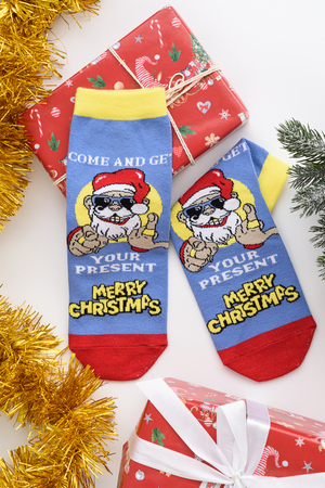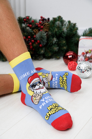 Оригинальные мужские новогодние носки. В комплекте 1 пара. На основной части носка изображение Санта Клауса и надпись "Come and get your present Merry Christmas". Оригинальная расцветка делает носки отличный подарком на Новый год.