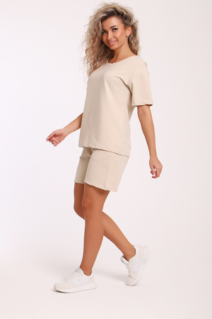 Костюм футболка с короткими рукавами и свободные шорты с карманами.