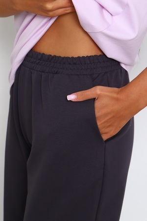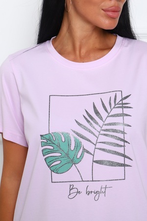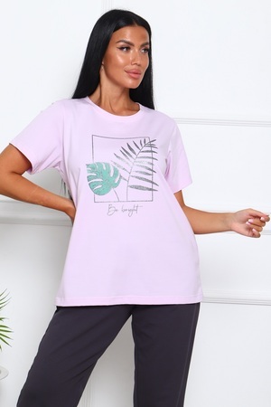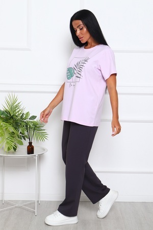 Костюм женский: брюки с удобными карманами в боковых швах, с комфортным поясом; футболка с короткими рукавами и стильным принтом с блёстками на полочке.